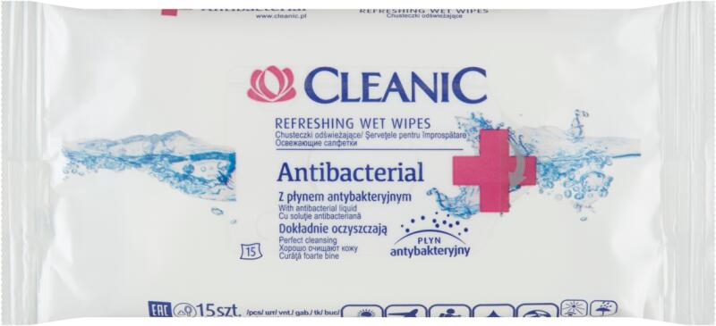 • Cleanic Antibacterial nedvesített frissítő törlőkendő a kézhez és testhez antibakteriális folyadékkal. Bőrgyógyászatilag tesztelt. A bőr számára semleges pH értékkel.